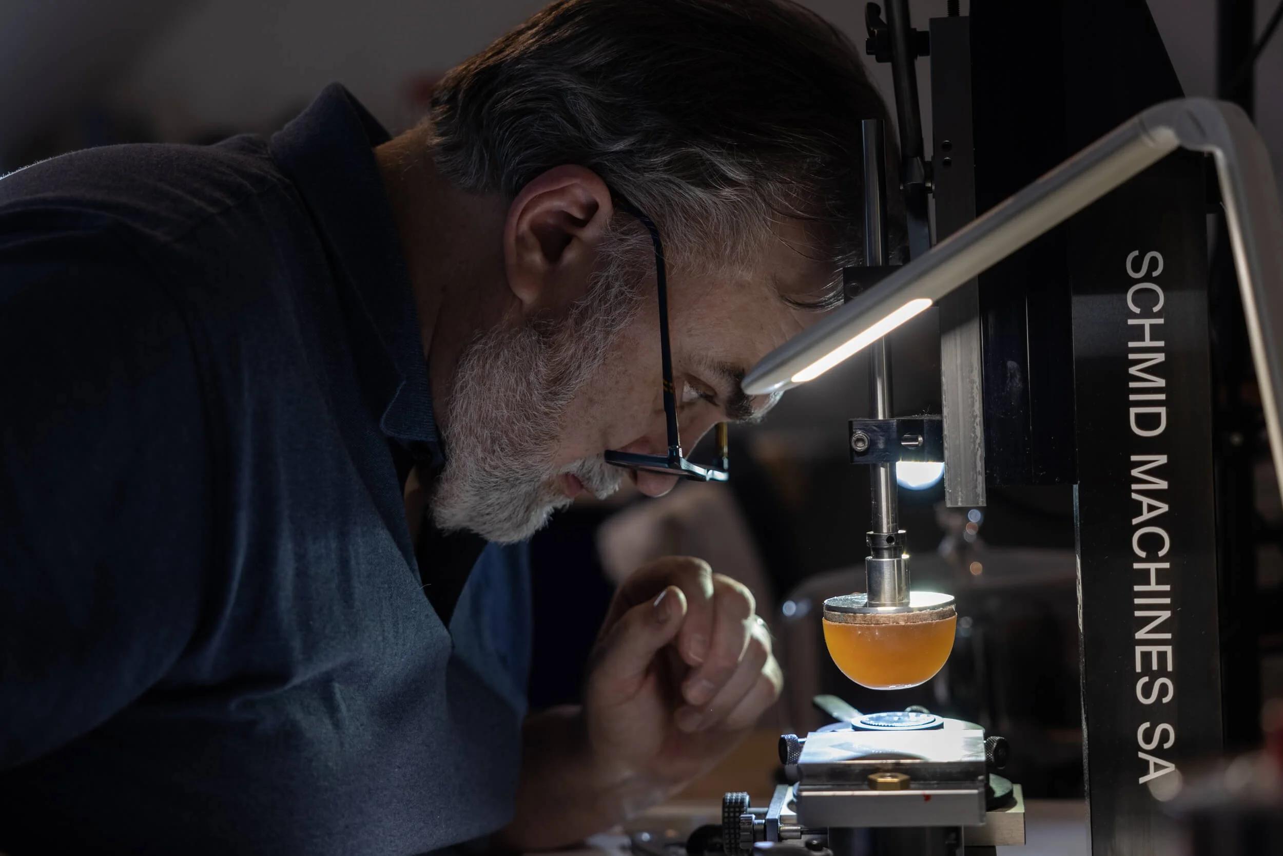 Now that the dial is cool, and hopefully unblemished and flaw free, it’s time to apply the numerals, indices and our Moriarty name on the freshly fired enamel. This is naturally also a hands-on process and Mike painstakingly sets up his pad printer with meticulous precision, because, like all of the other steps in this process, you don’t get a second chance to get it right.
